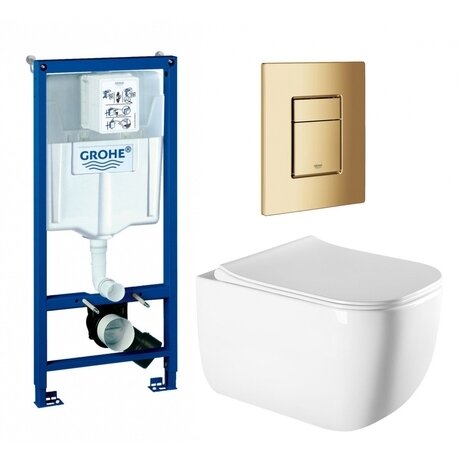 Нужна готовая система для подвесного унитаза? В комплект входит инсталляция Grohe, безободковая чаша и золотая кнопка смыва — устанавливается за один визит сантехника. Экономия времени на подборе компонентов и **гарантия совместимости 5 лет** от производителя. Три главных преимущества: - Безободковая чаша — на 40% меньше бактерий и налета, чистится за 2 минуты влажной салфеткой - Система антивсплеск — защищает от брызг при смыве - Сиденье с микролифтом — опускается бесшумно, не хлопает при закрытии Подходит для санузлов площадью **от 3 м²**. Габариты инсталляции: **113 × 50 × 23 см** (высота × ширина × глубина монтажа) — скрывается в стене или за фальшпанелью. Чаша высотой **35 см** удобна для взрослых и детей от 5 лет. Крепится к капитальной стене или в пол. Душевой слив — вода омывает чашу по всей поверхности, смывает с первого раза. Пневматическая кнопка из пластика в золотом цвете управляется легким нажатием, работает без электричества. Технические характеристики: - Диаметр слива 9 см — стандартный размер для подключения к канализации 110 мм через переходник 11 см - Направление выпуска горизонтальное — труба уходит в стену, не занимает место на полу - Подвод воды сбоку или сзади — подключается к любой разводке - Материал чаши: фарфор — не впитывает запахи, служит 15+ лет - Сиденье из дюропласта — не желтеет, выдерживает до 150 кг, снимается одним движением для мытья Вес комплекта 43 кг — доставляется в одной упаковке. Сборка не требуется — все компоненты готовы к установке. Производство Германия, бренд Grohe.Отзывы