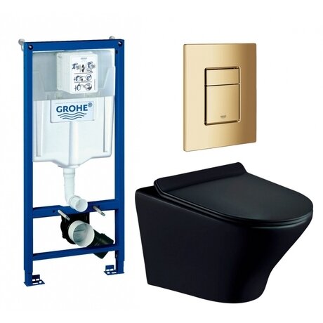 Ищете готовое решение для ванной комнаты? Этот комплект содержит всё необходимое: надежную инсталляцию Grohe, черный подвесной унитаз и золотую кнопку смыва. Сэкономите время на подборе компонентов и получите гарантию совместимости. Три главных преимущества: - Безободковая конструкция — легко мыть, нет труднодоступных мест для бактерий - Сиденье с микролифтом — закрывается бесшумно, не хлопает, служит дольше обычного - Гарантия 5 лет от Grohe — немецкое качество с официальной поддержкой производителя Подходит для санузлов от 4 м². Инсталляция занимает 50×49 см площади пола, чаша выступает на 49 см от стены. Идеальный вариант для ремонта в новостройке или модернизации ванной комнаты в квартире. Монтаж: крепится к капитальной стене или полу, высота установки 113 см. Подвод воды возможен сбоку или сзади бачка — выберете удобный вариант под вашу разводку. Сборка не требуется — получаете готовый комплект для установки. Материал — качественный фаянс, выдерживает ежедневные нагрузки. Каскадный слив распределяет воду по всей поверхности чаши равномерно. Диаметр слива 9 см (с переходником 11 см) — подходит для стандартной канализации. Сиденье — быстросъемное, снимается одним движением для уборки. Пневматическая кнопка золотого цвета работает бесшумно, не требует электричества. Вес комплекта 43 кг — учитывайте при доставке на этаж. Управление: две кнопки для экономии воды — полный и половинный слив. Прямой выпуск упрощает подключение к канализации в стене.Отзывы