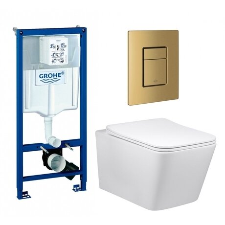 Нужно установить унитаз в новой квартире или при ремонте? Этот комплект — полное решение под ключ. В набор входит инсталляция Grohe, подвесной унитаз и золотая кнопка смыва — не придется докупать комплектующие и подбирать совместимость. Три главных преимущества: - Безободковая чаша — вы протираете всю поверхность за 2 минуты, грязь не скапливается в труднодоступных местах - Антивсплеск и антигрязевое покрытие — вода не разбрызгивается при смыве, капли не задерживаются на фарфоре - Сиденье с микролифтом — крышка опускается плавно и бесшумно, не нужно придерживать рукой Комплект подходит для ванных комнат от 4 м². Унитаз монтируется в стену — экономит 15–20 см пространства по сравнению с напольными моделями. Подойдет для квартир, загородных домов и офисов. Габариты инсталляции: высота 113 см, ширина 50 см, глубина 52 см. После установки видна только чаша унитаза высотой 35 см и кнопка — вся сантехническая система скрыта за фальшстеной. Минимальная глубина стены — 23 см. Технические характеристики: - Немецкая инсталляция Grohe — выдерживает нагрузку до 400 кг, гарантия производителя 5 лет - Пневматическая кнопка — управляется давлением воздуха, не требует электричества - Сиденье из дюропласта — не желтеет со временем, устойчиво к бытовой химии и царапинам - Горизонтальный выпуск — подключается к стандартной канализации в стене - Гибкая подводка воды — можно подключить сбоку или сзади бачка Комплект поставляется в собранном виде — не требует сложного монтажа. Крепится к капитальной стене или к полу с опорой на стену. Межосевое расстояние под крепежные шпильки — 18 см. Золотая кнопка — акцент в интерьере, подходит к современным ваннымв стиле минимализм или неоклассика. Корпус из прочного пластика не окисляется от влаги.Отзывы