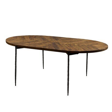 Изысканный оавльный обеденный стол, где лаконичность линий подчеркивает благородство материала. Конусообразные резные ножки чёрного цвета создают ощущение воздушной лёгкости и графичной точности, а наборная столешница тёмно-коричневого оттенка раскрывает всю глубину и характер натурального массива. Овальная форма делает каждый приём пищи особенным, объединяя гостей в атмосфере гармонии и уюта.