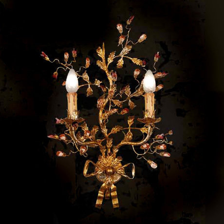 Бра 2-х рожковое на металлической арматуре состаренного белого цвета с золотой патиной. Декор: прозрачные кристаллы Swarovski в виде лепестков. Возможны различные покрытие металла и цвет камней. Количество лампочек: 2. Мощность: 2 x 40 Вт. Тип лампы: Накаливания, E14.